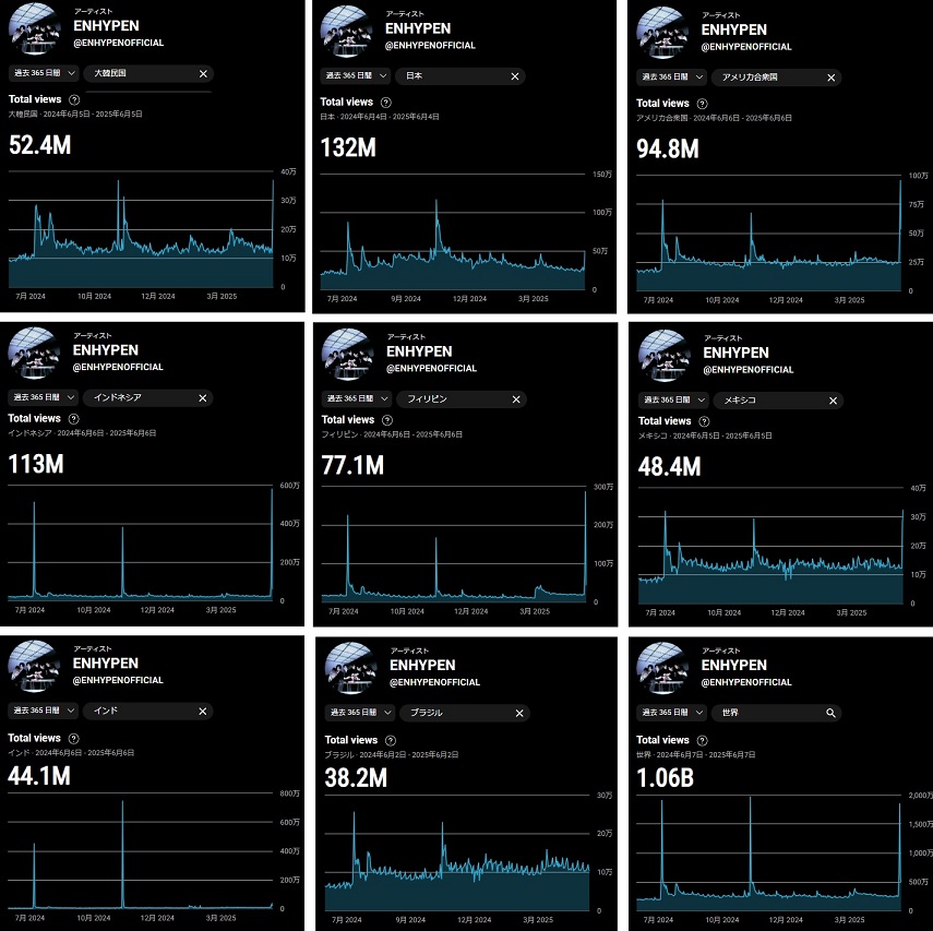 これは、韓国の KPOPグループ「ENHYPEN」の youtube Music Charts における各アーティストの国別楽曲再生数グラフです。国別再生数上位8ヵ国を抜き出しました。