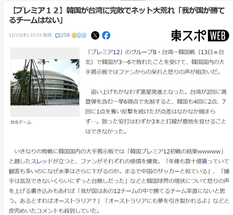 「プレミア12」のグループB・台湾―韓国戦(13日=台北)で韓国が3―6で敗れたことを受けて、韓国国内の大手掲示板ではファンからの呆れと怒りの声が相次いだ。