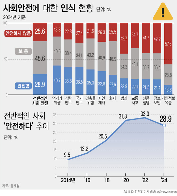 12일 통계청이 발표한 ‘2024년 사회조사’에 따르면, 우리 사회가 안전하다고 생각하는 비중은 2년 전보다 4.4%p 감소한 28.9%인 것으로 나타났다. 연도별로 살펴보면, ▲2014년(9.5%) ▲2016년(13.2%) ▲2018년(20.5%) ▲2020년(31.8%) ▲2022년(33.3%)으로 꾸준히 상승하다가 다시 20%대로 떨어졌다.