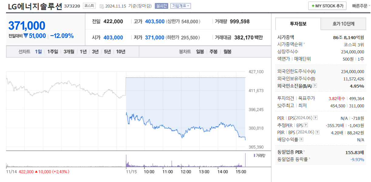 15日午後3時30分、有価証券市場の終値基準でLGエナジーソリューション、ポスコホールディングス、サムスンSDIなど2次電池関連大型株が揃って6~12%下落した。LGエナジーソリューションは前日より4.5%安の40万3000ウォンで始まり、取引中に下げ幅が広がり12.09%(5万1000ウォン)下がった37万1000ウォンで取引を終えた。ポスコホールディングスも前取引日より10.48%(3万2500ウォン)安の27万7500ウォンで取引を終えた。サムスンSDI(-6.81%)、ポスコフューチャーM(-9.50%)、LG化学(-3.30%)も、取引後半になるほど下げ幅が大きくなった。コスダック市場ではエコプロBM(-7.85%)、エコプロ(-4.81%)が急激に下がった。