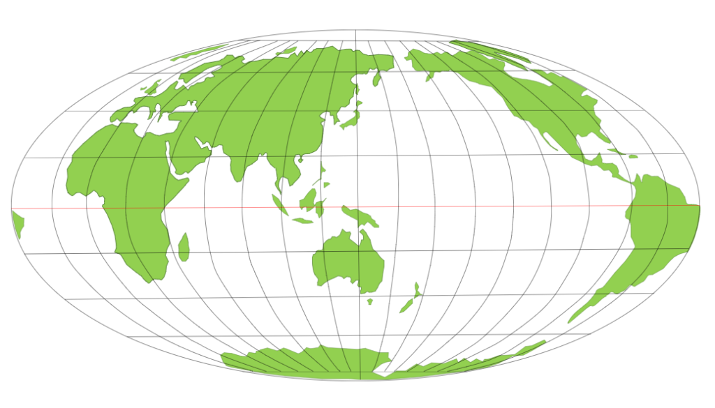 ・メルカトル図法・・・経線と緯線が直角に交わっていて、赤道から離れれば離れるほど、実際よりも面積が大きい地図