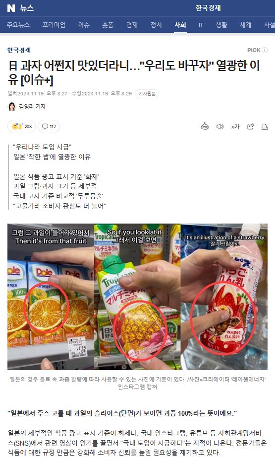 日本の細部的な食品広告表示基準が話題になっている。 国内インスタグラム、ユーチューブなど社会関係網サービス(SNS)で関連映像が人気を集め「国内導入が至急だ」という指摘が出ている。 専門家らは、食品に対する規定だけは強化し、消費者の信頼を高める必要性を提起している。 映像クリエイター「レイチェルエナジー」、「知識窓」等が掲載した映像によると、日本の場合、果物ジュースにより果汁含量に差がある。