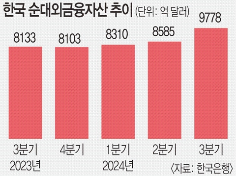 20일 한국은행이 발표한 3분기(7~9월) 국제투자대조표에 따르면, 3분기 말 순대외금융자산은 9778억달러로 집계됐다. 전 분기 대비 1194억달러가량 늘어나며 처음으로 9000억달러를 돌파했다. 순대외금융자산은 우리나라 국민이 해외에 투자한 금융자산에서 금융부채를 뺀 것으로, 이 값이 양(+)이면 국내 투자자가 해외에 투자한 금융자산이 외국인이 우리나라에 투자한 금융자산보다 많다는 것을 뜻한다. 우리나라 순대외금융자산은 3분기 연속으로 역대 최대치를 경신하고 있다.