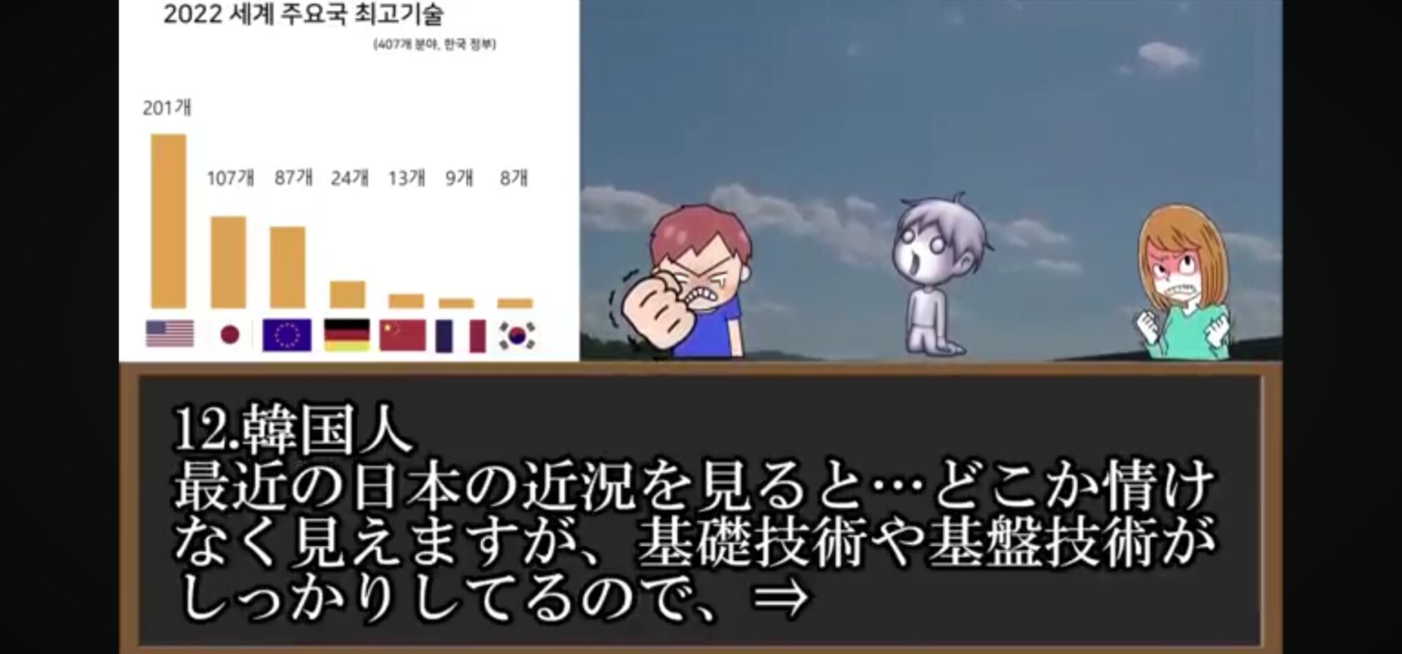 韓国人は日本と韓国の経済規模の差くらい考えてから書きな。韓国なんて歯牙にも掛からないし、眼にも入らないんだよ。日本を馬鹿みたく意識しているのは韓国人だけだね。韓国の技術力十分の1以下… 8%……