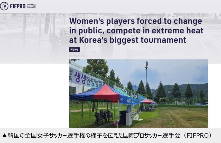 今年8月に韓国で全国女子サッカー選手権が行われた時、競技場にきちんとしたロッカールームが備えられていなかったため、選手たちは目隠しのないテントやトイレで着替えなければならなかった。同大会は韓国国内の女子サッカー大会では最も規模が大きいものだ。こうした状況は社団法人・韓国プロサッカー選手協会の暴露により明らかになった。国際プロサッカー選手会(FIFPRO)も同月、公式ホームページに「人々の前で着替えなければならなかった女子選手たち 猛暑の中、韓国最大規模の大会に出場」という見出しで報じ、この状況をシェアしたりもした。