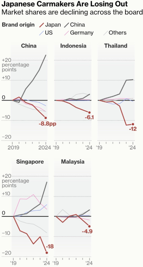 일단 동남아뿐 아니라 세계 최대 자동차 시장인 중국에서 일본차들이 점유율이 폭스바겐급은 아니지만 하락하고 있음.