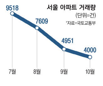 下半期の景気指標の一つである不動産取引市場も冷え込んでいる。 この日、国土交通部が発表した10月の住宅統計によると、先月ソウルのマンション売買取引量は4000世帯と集計された。 前月(4951世帯)比19.2%減少した数値だ。 今年4月(4840世帯)以後、6ヵ月ぶりに最も少ない取引量だ。