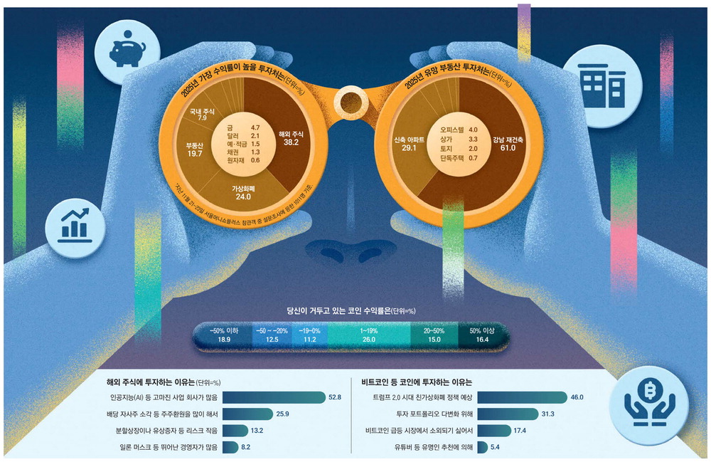 「2025年に最も有望な投資商品は何か」という質問に最も多い回答者が「海外株式」(38.2%)と答えた。 その後をビットコインなどコイン(24.0%)、国内不動産(19.7%)、国内株式(7.9%)、金(4.7%)、預·積金(1.5%)、債券(1.3%)、原油·銅などの原材料(0.6%)が続いた。 2年前の2022年選好度調査では不動産(28.4%)が1位だった。 当時、海外株式を挙げた参観客の割合は20%だったが、2倍水準で選好度が跳ね上がった。