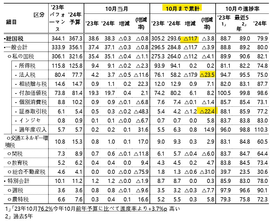 2024年01~10月の累計で、韓国政府の総国税収入は「293.6兆ウォン」で、対前年同期比「11.7兆ウォン」のショートです。
