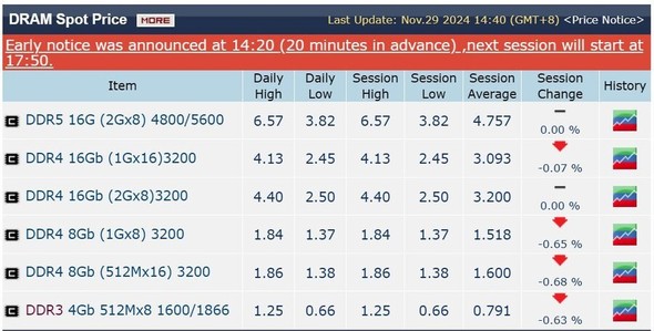 29日の「DRAMeXchange」の情報によると、パソコン用DRAM汎用製品(DDR48Gb1Gx8)の11月の平均固定取引価格は前月比20.59%下がった1.35ドルと集計された。DRAM価格は昨年10月から概して上昇曲線を描いていたが、5~7月に横ばいを経て8月に下落転換した。続いて9月には前月比17.07%急落し、10月は変動がなかった。メモリーカード・USB用NAND型フラッシュ汎用製品(128Gb 16Gx8 MLC)の11月の平均固定取引価格は前月比29.80%下落した2.16ドルとなった。NAND価格は昨年10月から5カ月連続で上昇した後、横ばいを維持していたが、9月から下落傾向に転じた。