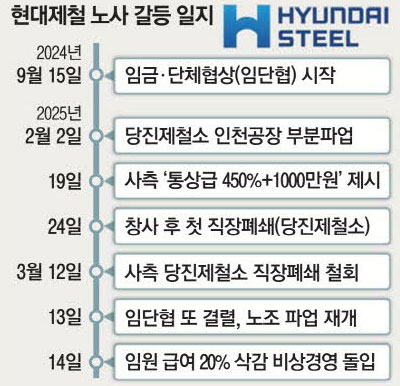 先立って労組は今年1月、現代自動車グループのチョン·ウィソン会長の自宅付近でデモを始め、唐津製鉄所の冷延ラインと仁川富平工場などで部分ストライキを行った。 会社側は、創業以来初の職場閉鎖(唐津製鉄所)措置まで断行する強硬策を取ったが、労組はストを止めなかった。