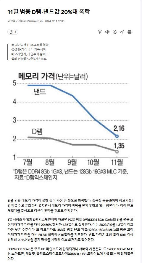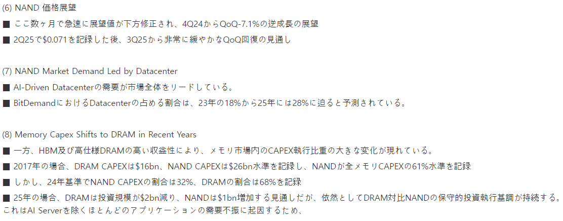 25年の場合、DRAMは投資規模が$2bn減り、NANDは$1bn増加する見通しだが、依然としてDRAM対比NANDの保守的投資執行基調が持続する。 これはAI Serverを除くほとんどのアプリケーションの需要不振に起因するため、>>131