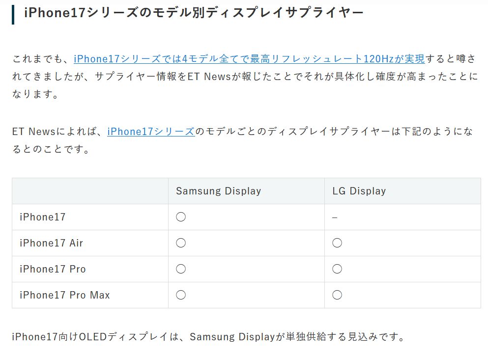 아이폰17 전 모델에 LTPO가 채택되면서 국내 디스플레이 업체가 아이폰17 시리즈에 OLED를 전량 공급할 것으로 관측된다. LTPO는 기술 난도가 높아 진입장벽으로 작동하고 있다. 애플 아이폰 LTPO는 그동안 삼성디스플레이와 LG디스플레이가 전량 공급했다. 애플은 중국 디스플레이 업체에서도 OLED를 수급하고 있지만, LTPS만 일부 맡겼을 뿐 LTPO는 없었다. 중국 업체는 또 LTPS 패널에 대해서도 매년 품질 이슈가 발생하면서 공급에 난항을 겪고 있어 제조 난도가 더 높은 LTPO 공급은 현실적으로 불가능하다는 게 중론이다.トランプ政権になるから中国製部品はいつ制裁対象なるかわからんから怖くて使えないので、まぁ南朝鮮が受注しやすくなるのは当然の帰結ではあるわな。