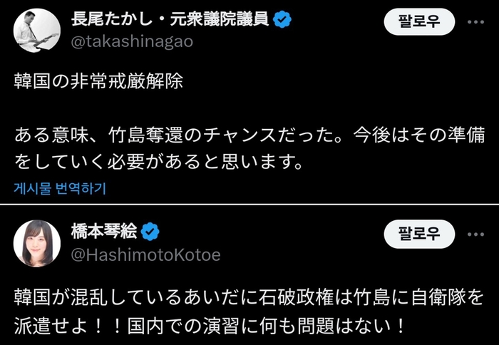徐教授によると、日本の衆議院議員を務めた長尾隆は自身のX(元ツイッター)で「韓国の非常戒厳解除、ある意味で竹島奪還の機会だった。 今後はその準備をしていく必要がある」と主張した。