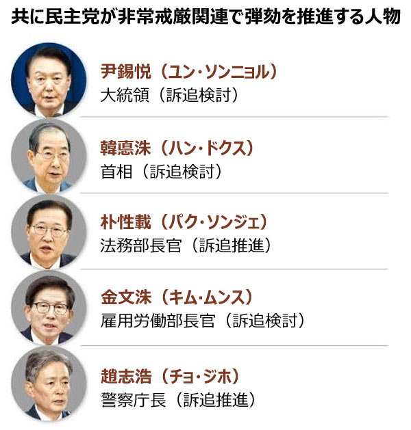 共に民主党は首相に加え当時国務会議に出席していた国務委員全員についても「内乱謀議に積極的に加担した」との疑惑を主張している。国務会議は賛成反対で何かを決めるのではなく審議だけを行う場であり、大統領の行動を阻止する法的な方法はない。そのため事前に知って直接加担した国務委員でなければ責任を追及するのは難しい。共に民主党の今の動きを見ると、首相に加えて経済副首相を含む国務委員らも弾劾に乗り出す可能性もありそうだ。
