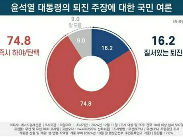 11日に実施した調査の結果によると、「即時辞任または弾劾で尹大統領の職務を停止させるべきだ」との意見が74.8%だった。「与党が提案した『尹大統領の秩序ある退陣』を進めるべきだ」との意見は16.2%にとどまった。9.0%は「よく分からない」と回答した。