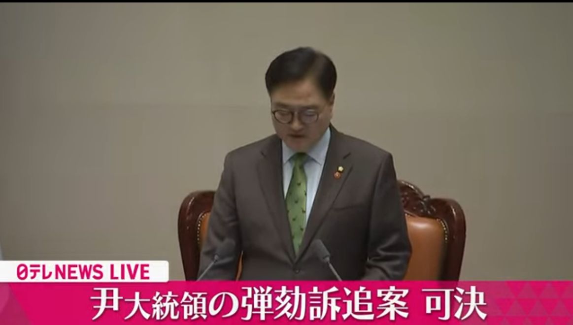 【ソウル聯合ニュース】韓国国会は14日午後の本会議で、尹錫悦(ユン・ソクヨル)大統領の弾劾訴追案を賛成多数で可決した。大統領の職務権限は同日停止され、韓悳洙(ハン・ドクス)首相が大統領職を代行する。大統領の弾劾案可決は2004年の盧武鉉(ノ・ムヒョン)氏、16年の朴槿恵(パク・クネ)氏に次いで3例目。このうち朴氏は憲法裁判所の判断によって罷免された。