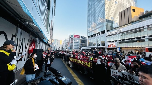現場では少女時代の『Genie』『Into The New World』、aespaの『Whiplash』、ロゼの『APT』などK-POPがしきりに流れた。市民たちはアイドルのペンライトなど各種道具を振りながら一緒に歌った。2016年、朴槿恵(パク・クネ)元大統領退陣要求集会で民衆歌謡が歌われたこととは全く違う姿だった。