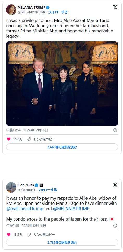 マスク氏のXから(16日)「安倍(元)総理の妻である昭恵夫人が、(トランプ氏の邸宅)マー・ア・ラゴを訪問し、トランプ夫妻と夕食をとられた際、表敬できたことは光栄でした」