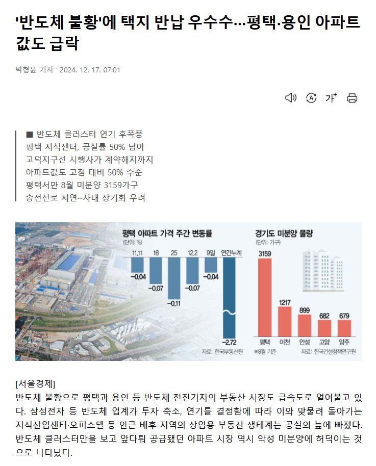 一方、物を知らない韓国人は知らない故にちょっとした関わりを自慢し始める。半導体不況で平沢や龍仁など半導体前進基地の不動産市場も急速に凍っている。サムスン電子など半導体業界が投資縮小、延期を決めるにつれ、これと噛み合って帰る知識産業センター・オフィステルなど近くの背後地域の商業用不動産生態系は空室の沼に陥った。半導体クラスターだけを見て先を争って供給されたアパート市場も悪性微分量に苦しむことが分かった。