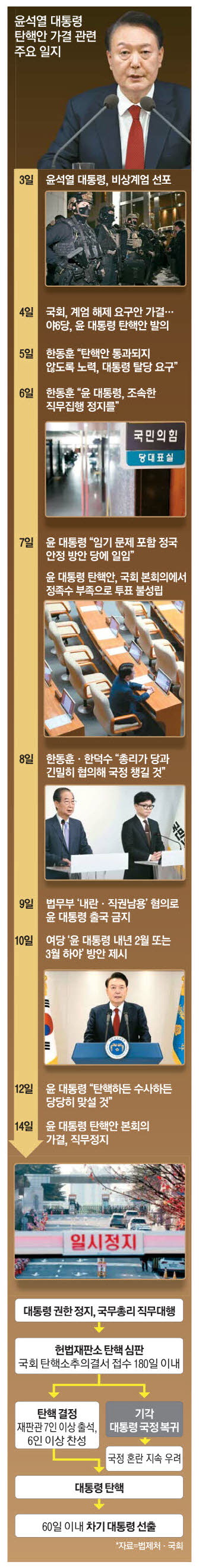 韓国国会では、野党6党と無所属議員191人が前日に発議した弾劾訴追案を13日午後2時4分に本会議へ報告した。弾劾訴追案は本会議報告から24時間後、72時間以内に票決しなければならない-という国会法の定めにより、禹元植(ウ・ウォンシク)国会議長は「14日午後4時に本会議の票決にかける」と表明した。進歩(革新)系最大野党の民主党など野党側は、尹大統領が12・3非常戒厳の過程で憲法・戒厳法・刑法などに違反したと主張した。