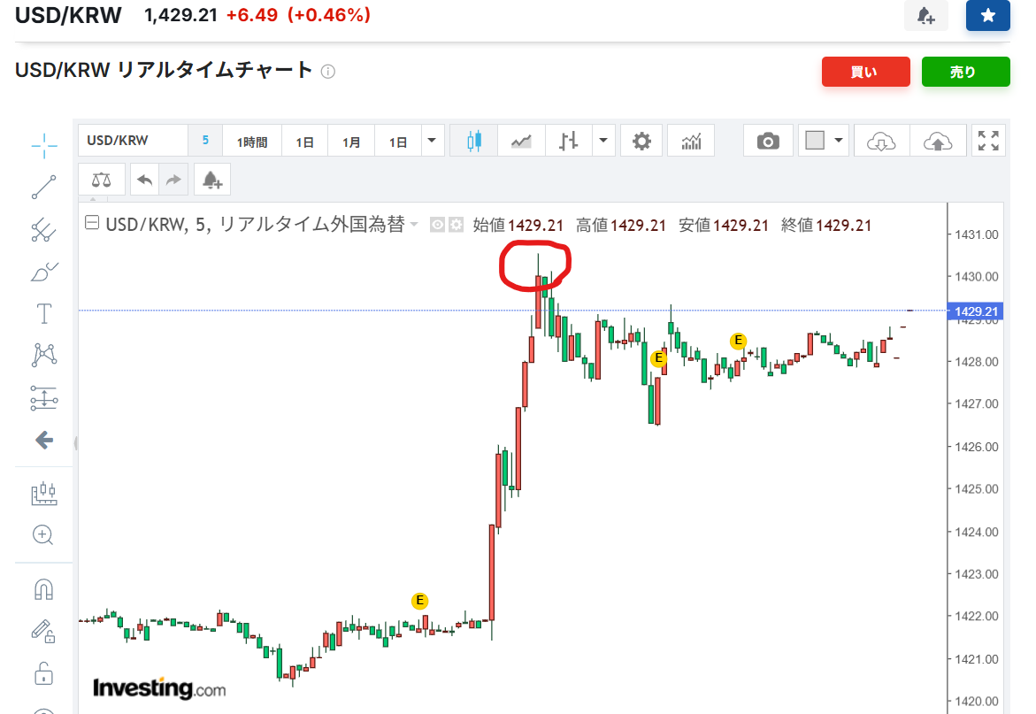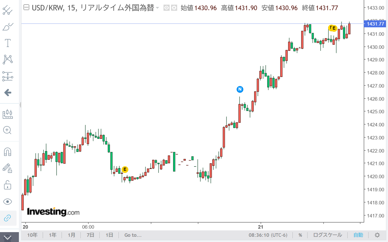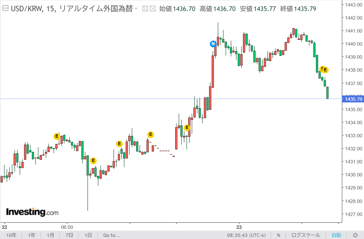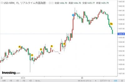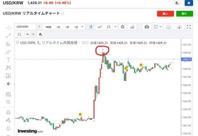 専門家は、当面ウォン相場が1ドル=1400ウォン台で不安定な動きを続けると見ている。iM証券のパク・サンヒョン研究員は「政府の口先介入は、スピード調整程度の効果しかない」とし「米中貿易葛藤という予期せぬ悪材料が発生したため、短期的には1420~1430ウォン台で推移する可能性が高く、アジア太平洋経済協力(APEC)首脳会議の結果が最初の分岐点になるだろう」と予測した。16:30くらいに1,435.74にタッチしてたんだねー