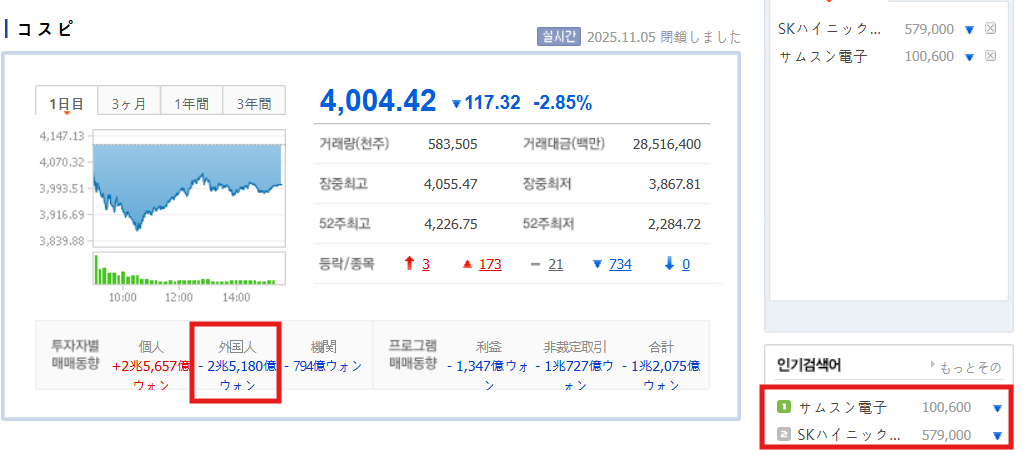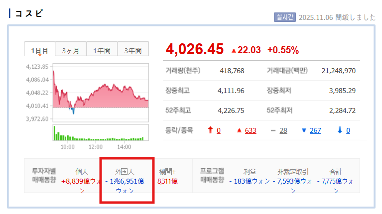 4200線を突破したコスピがわずか2取引で3900線下に暴落した。 AIバブル論の拡散に間夜、ニューヨーク証券市場が技術株を中心に下落し、国内証券市場に悪材料として作用する姿だ。外国人は2取引日連続大規模な売り物量を注ぎ、暴落を主導している。