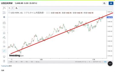 1401~1450ウォン 輸入依存度の高い韓国が輸入額増加により貿易赤字になるライン 上昇負荷は全身に走る恥辱と 銀行という銀行からの流血