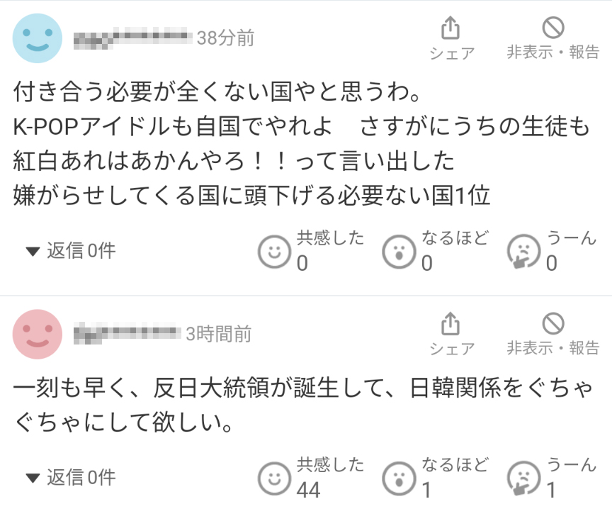 たとえば「日韓外交安保協力が事実上停止」といったニュースには、数時間で100を超えるコメントが付いていた。全コメントに目を通したが、俺が読んだタイミングでは、その全てが「韓国と距離を置きたい、無関係になりたい、断交したい」という内容だった。「韓国と仲良くしたい」というコメントが1つも無かったのだが、「そりゃそうだろう」としか思えない。