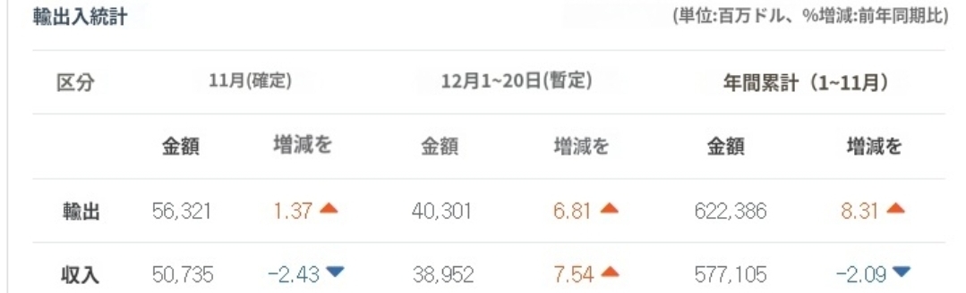 経済危機に変化は無い。한국 12월 1-20일 수출액 403억 달러