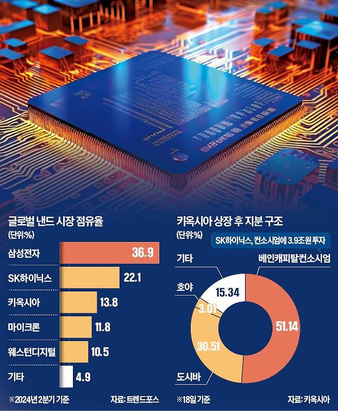 キオクシアは2020年と2021年にIPOを推進したが、コロナ19拡散で不発になった。以後、IPOの代わりに世界4位のNAND企業米国ウエスタンデジタルとの合併で企業価値を上げようとしたが、主要投資家であるSKハイニックスが反対して無算になった。 SKハイニックスはベーンコンソーシアムに約3兆9000億ウォンを投資し、株式15%(上場前)を間接保有している。
