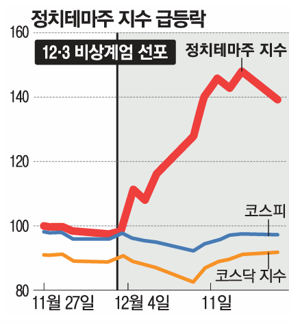 金監院は同日、政治テーマ株指数も発表した。 該当指数は戒厳事態当日の3日以後、16日まで日別騰落率が最低5.79%下落から最高12.98%上昇まで非常に大きな変動性を示した。 同期間、コスピの1日最大下落率は2.78%、上昇率は2.43%に止まった。 コスダックの最大下落率と上昇率はそれぞれ5.19%と5.52%だった。