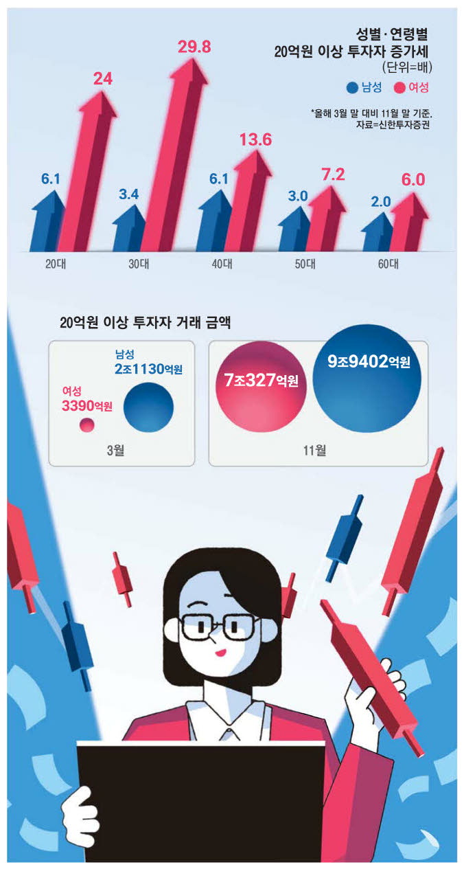 約定金額の増加傾向も女性が目立つ。 今年9~11月の女性高額投資家の約定金額は1~3月比21倍増え、計7兆327億ウォンを記録した。 一方、男性は4.7倍増えた9兆9402億ウォンだった。 絶対的な金額だけを見れば、男性の取引代金の規模がさらに大きいが、増加傾向は女性が圧倒的だ。