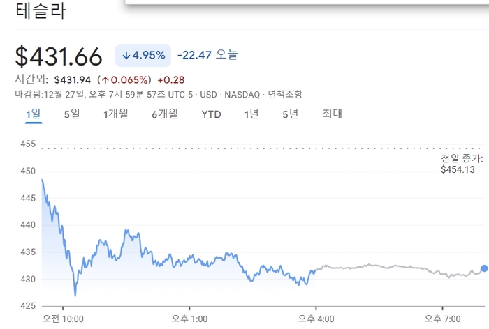米電気自動車メーカーのテスラの株価が12月最後の金曜日に大幅に下がった。 27日(現地時間)、ニューヨーク証券市場でテスラの株価は前日より4.95%下がった431.66ドルで取引を終えた。 同日、テスラの株価は前日の終値(454.13ドル)より低い449.52ドルでスタートし、数回の反発を試みたが急落した。