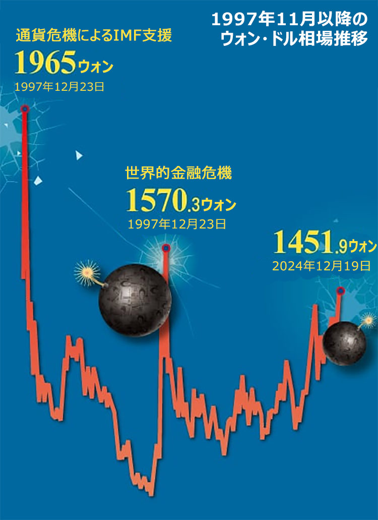 今年初め時点で1300ウォン台だったウォン相場は米国の利下げ期待からウォン安傾向が一時的に鈍ったが、トランプ氏が米大統領選で勝利して以降は再びウォン安が進んだ。非常戒厳宣言と大統領弾劾訴追など不安な韓国政局と米国の金融政策転換が重なり、12月19日には1451ウォンを割り込んだ。