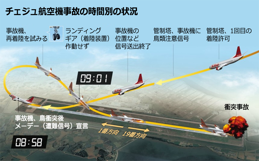事故機は先月29日午前8時59分に鳥の衝突(バードストライク)によるメーデー(遭難信号)を叫んだ後に復行を通知し、4分後の午前9時3分ごろ滑走路終端に設置されたローカライザーと衝突して乗客の大半が死亡した。