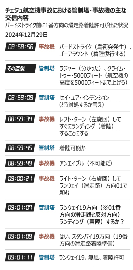 専門家たちは当時、「管制塔とパイロットの選択が適切だったのか詳しく調査すべきだ」とした上で「こうした内容が含まれている事故時の交信記録全体を公表しなければならない」と指摘した。最終的な事故調査報告書が出るまでには1年以上の時間を要するが、調査主体の韓国国土交通部(省に相当)航空鉄道事故調査委員会が交信の一部しか公表していないため、不必要な憶測ばかり招いているということだ。航空鉄道事故調査に関する法律は交信記録について「公表しないこともある」とだけ規定しており、公表するかどうかは調査委の裁量となっている。