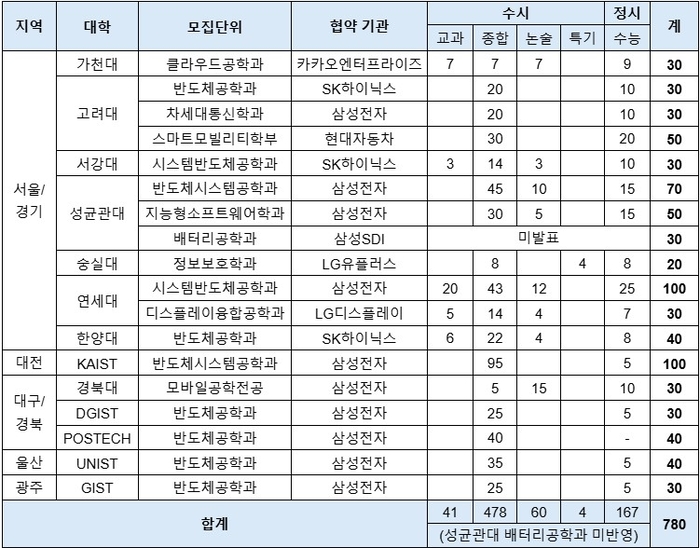 今年は成均館(ソンギュングァン)大学が契約学科を追加で設立し、昨年より募集単位が1つ増えた。 成均館大は昨年7月、サムスンSDIと「バッテリー工学科」設置協約をした。 2026学年度の初入学以後10年間、毎年30人規模の新入生を選抜する計画だと発表した。