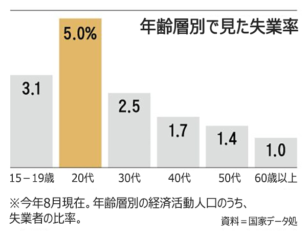 10月3日に国家データ処が発表したところによると、今年8月現在の年齢層別失業率(経済活動人口中の失業者の比率)は20代が5%で、全ての世代の中で最も高かった。続いて15-19歳(3.1%)、30代(2.5%)、40代(1.7%)、50代(1.4%)、60代以上(1.0%)という順だった。仕事をせず、仕事探しもしない「ただ休んでいるだけ」の青年(15-29歳)は、今年2月に初めて50万人を超え、その後も40万人から50万人で過去最高の水準に達している状況だ。