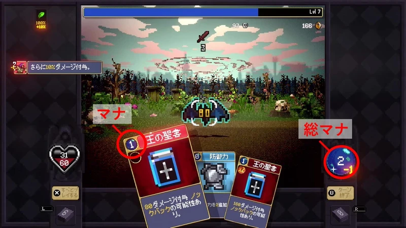 各カードの左上には「マナ」が表記されており、1ターンに使用できる総マナ量の範囲内でカードを選択し、敵を攻撃。すべてのカードもしくはマナを使い切ると、敵のターンとなります。その後、新たなカードを引いて自分のターンへ。これを繰り返し、敵を倒していきます。
