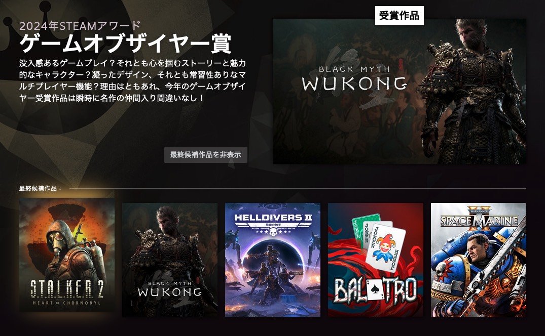 2024年を代表する作品に贈られる「ゲームオブザイヤー賞」には、Game Scienceが手がけたアクションRPG『黒神話:悟空』が選ばれた。『HELLDIVERS 2』や『Balatro』『Warhammer 40,000: Space Marine 2』『S.T.A.L.K.E.R. 2: Heart of Chornobyl』といった話題作を抑えての受賞である。