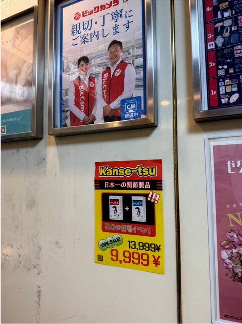 韓国人と見られるユーザーは自身のブログでも“謎の薬”を紹介していた。昨年12月に公開されたブログには、大手家電量販店チェーン・ビックカメラの敷地内とみられる場所に貼られた「かんせ」のポスターの写真などがアップされている。ポスターには「日本一の関節製品」として「かんせ 上」および「かんせ 下」の写真と、割引価格とされる「9,999¥」という数字が表記されている。