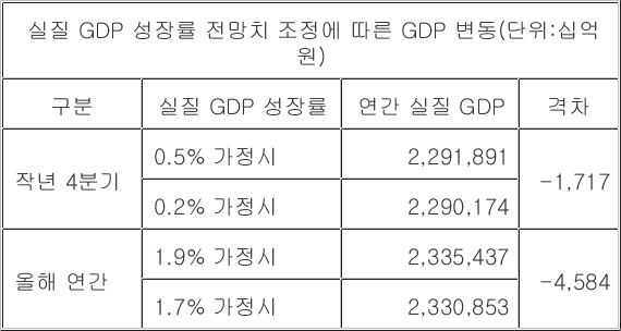 昨年の年間実質GDPは第4四半期の成長率を0.5%と仮定すれば2千291兆8千910億ウォン、0.2%と仮定すると2千290兆1千740億ウォンと1兆7千170億ウォン差が出る。