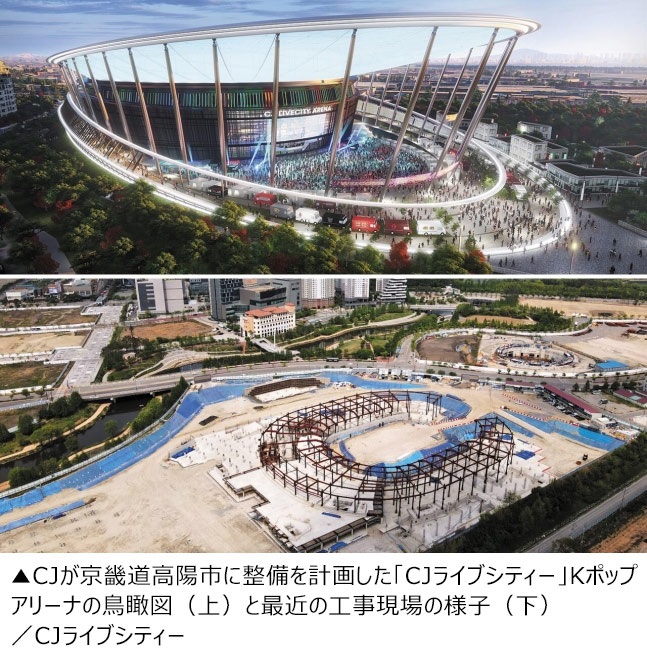 「KPOP の殿堂」となるはずだった「CJライブシティ」の完成予想図(2024年開業予定だった)と、計画が破棄されて錆びた骨組みだけが残った現在の状態。