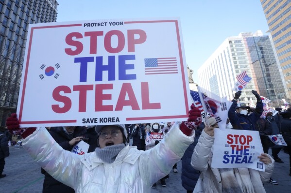 #「STOP THE STEAL。人間が最も嫌う喪失感、それを煽動せよ」=2021年1月6日。大統領選挙敗北に不服だったトランプ支持者のホワイトハウス前のデモは不正選挙で勝利を盗まれたという「STOP THE STEAL」のプラカードでいっぱいだった。尹大統領の逮捕・拘束に抵抗するデモ隊もこれをそのまま借用していた(その下には「不正選挙検証」「SAVE KOREA」も書かれている)。