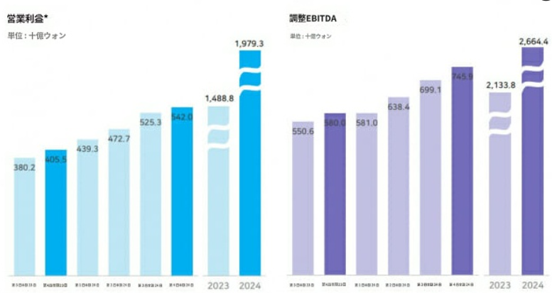 4분기에는 매출액 2조 8856억 원, 영업이익 5420억원을 기록했다. 이는 전년 동기 대비 각각 13.7%, 33.7% 성장한 수치다. 영업이익은 8분기 연속 성장했다. 영업이익률은 18.8%이고, 조정 EBITDA는 7459억원을 기록했다.