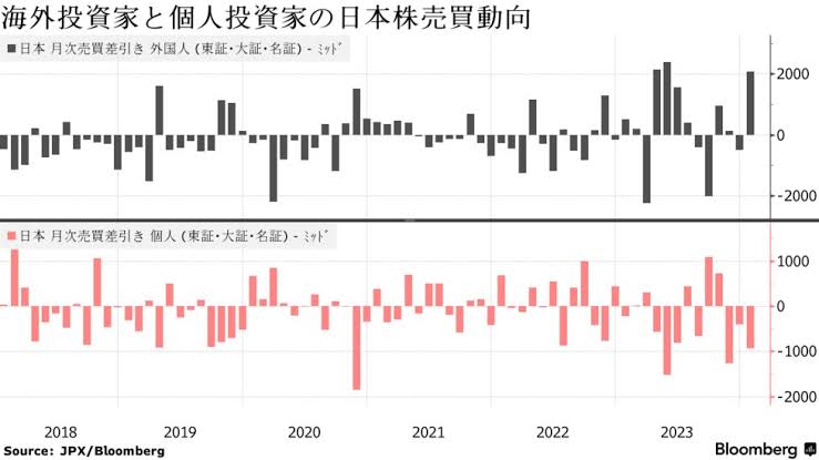 黒が外国人投資家。ここ3年はほぼ買い越しのみ