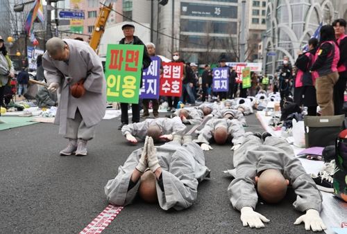 同日、大韓仏教曹渓宗社会労働委員会、汎仏教時局会議などは午前11時、鍾路区曹渓宗大雄殿で祈りを捧げた後、憲法裁判所まで五体投地を行い、憲法裁の全会一致罷免を要求した。
