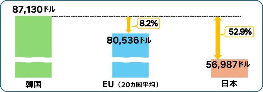 韓国の経営者団体「韓国経営者総協会(経総)」の調査によると、2022年時点で韓国における大企業の平均年俸は8万7130ドル(約1327万円)で、これは日本の5万6987ドル(約867万円)の1.5倍、欧州連合の8万536ドル(約1226万円)の1.1倍に達していた。国民所得に対する大企業の賃金水準も韓国では1人当たりGDP(国内総生産)の157%で、日本(121%)やEU(135%)よりもはるかに高かった。それだけ人件費負担が大きく、これが企業の競争力を低下させているのだ。