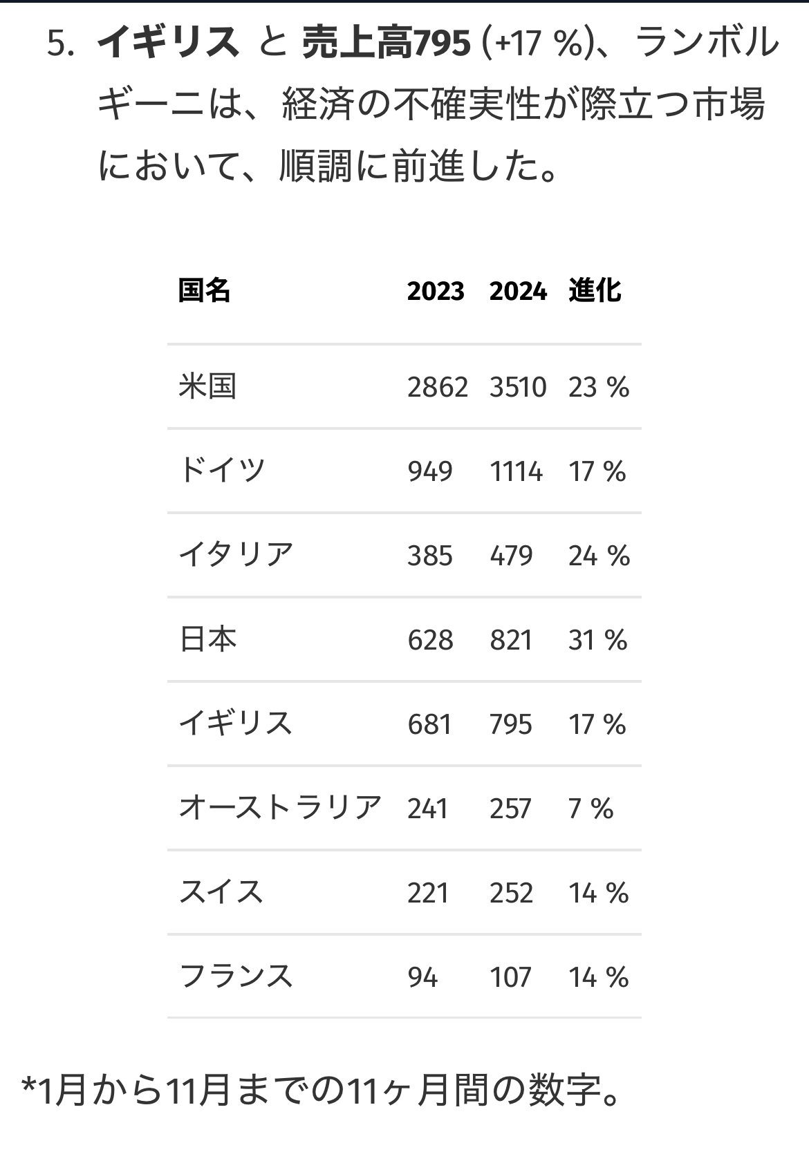 지난해 한국과 이탈리아에서 팔린 람보르기니 판매량이다. 람보르기니의 한국 판매량이 본국인 이탈리아를 처음 추월한 것은 2023년이다. 이후 2년 연속 판매량이 늘어나면서 람보르기니 회장이 직접 한국 방문을 계획할 정도로 슈퍼카의 주력 시장으로 떠오르고 있다.